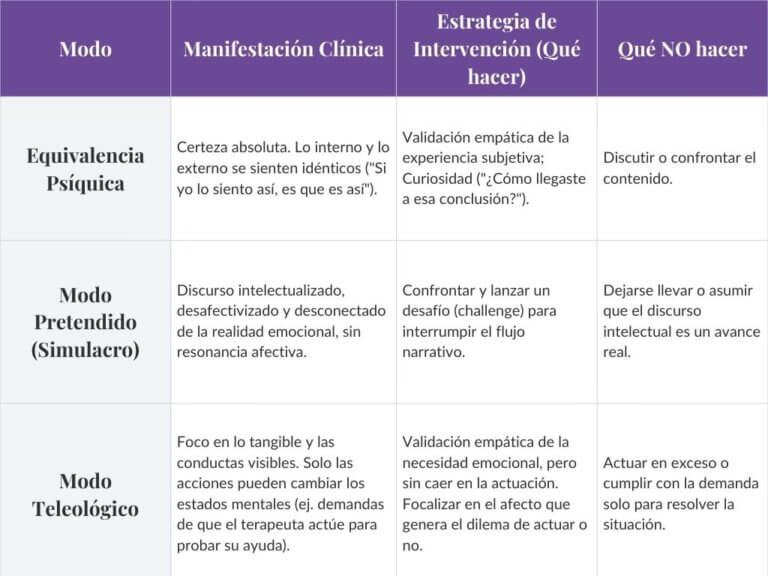 Cuando la mentalización se pierde, especialmente bajo altos niveles de excitación emocional, resurgen los modos prementalizadores. El terapeuta MBT debe estar alerta a estos modos para restaurar la capacidad mentalizadora: